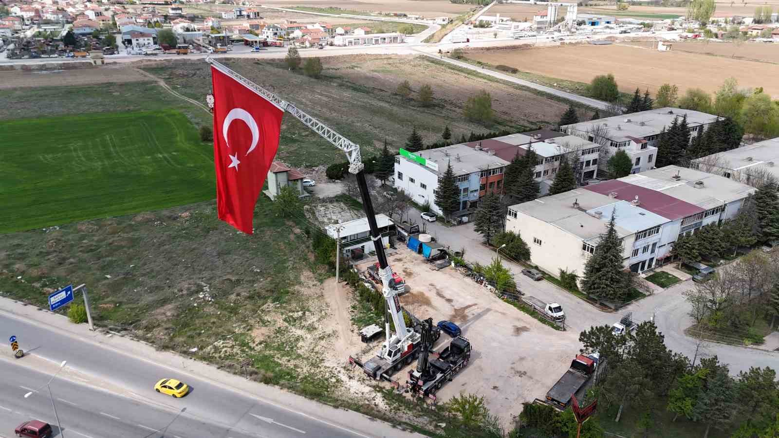 Eskişehir’de vinç kiralama işletmeciliği yapan bir kişinin, 23 Nisan Ulusal Egemenlik ve Çocuk Bayramı vesilesiyle işletmesinde bulunan bir vince astığı dev Türk bayrağı, Eskişehir Çevreyolunda vatandaşlara adeta görsel bir şölen oluşturdu.