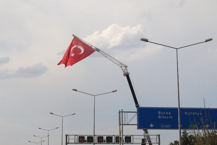 23 Nisan Ulusal Egemenlik ve Çocuk Bayramı dolayısıyla işletmeci vatandaş, günlük kirası 80 bin TL’den başlayan vinçlerden birine dev Türk bayrağını astı. Dalgalanan Türk bayrağını, gören sürücülerin sık sık korna çalarak bayrağı ve işletimciyi selamladığı görüldü. Bayrağın, hafif rüzgâr ile dalgalandığı anlar ise adeta görsel bir şölen oluşturdu.